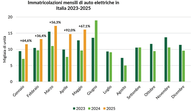 L’auto elettrica torna a correre: da gennaio a maggio 2025 le immatricolazioni mensili “green” in Europa sono cresciute in media del 21,9% e in Italia addirittura del 63,3%, meglio anche del 2023, con un picco di +92% ad aprile. Lo rileva lo Smart Mobility Report 2025, redatto dall’Energy&Strategy della School of Management del Politecnico di Milano, presentato il 9 luglio 2025.