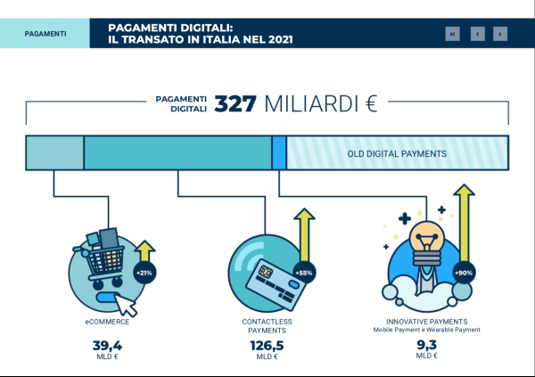 Proprio in questo contesto, però, gli italiani hanno dimostrato il cambio di passo definitivo nei confronti della digitalizzazione dei pagamenti: anche senza incentivi, i pagamenti digitali continuano a crescere con la stessa forza anche nella seconda metà dell’anno, raggiungendo quota 327 miliardi di euro e con un incremento complessivo rispetto al 2020 pari al +22%.
