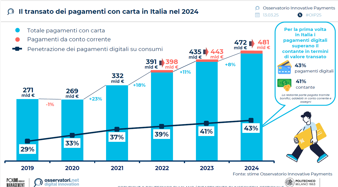 Nel 2024 i pagamenti digitali per la prima volta hanno superato il contante in Italia. I pagamenti innovativi sono cresciuti del 53%. Il Buy Now Pay Later (BNPL) ha continuato la sua espansione. Il numero di POS in Italia ha raggiunto i 3,5 milioni. Sono alcuni dei risultati emersi dalla ricerca dell’Osservatorio Innovative Payments del Politecnico di Milano e presentata il 13 marzo 2025 durante il convegno “Innovative Payments: operazione sorpasso”.