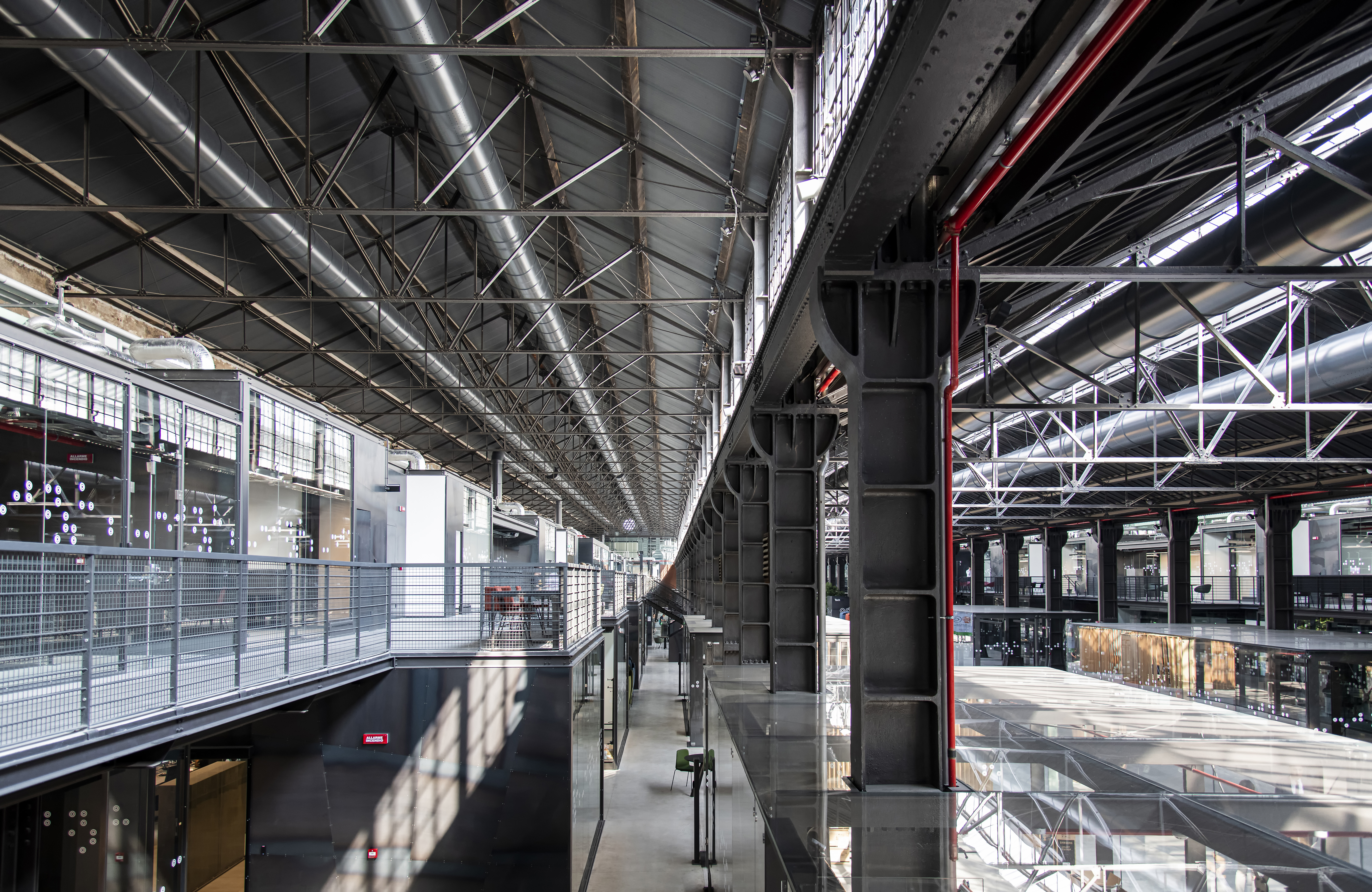 Un boulevard di 200 metri definisce l’ampia navata centrale delle OGR Tech, illuminate naturalmente dalle grandi vetrate del tetto a 16 metri di altezza: ai lati di questo spettacolare cannocchiale prospettico – vera e propria agorà per l’incontro tra persone e lo scambio delle idee – si aprono due campate caratterizzate da ambienti di cristallo per sale riunioni e uffici open space su due piani, modulari e flessibili, con 500 postazioni di lavoro “smart”, tavoli ‘social’, aree “chat sofa” e “phone booths” insonorizzate, scrivanie ergonomiche ad altezze regolabili in stile headquarters di Google per il massimo comfort sul lavoro. E ancora: 50 schermi ledwall e videowall per la trasmissione in real time delle news di canali come Bloomberg o CNBC, oltre a contenuti e dirette streaming di eventi globali come TechCrunch Disrupt SF o Web Summit.