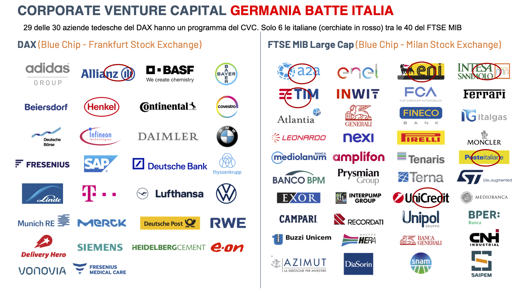 Quello che ho riscontrato è che in Germania delle 30 Aziende facenti parte del DAX (il più importante indice azionario tedesco) ben 29 hanno programmi di Corporate Venture Capital. Stiamo parlando del 97% delle aziende DAX, non esattamente di un numero qualunque.