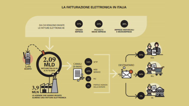 Dopo il 2016 (anno successivo all’introduzione della fatturazione elettronica vero le PA), il 2019 è stato il periodo che ha registrato la crescita più elevata, +14%, rispetto ad un incremento medio annuale dell’11%.
