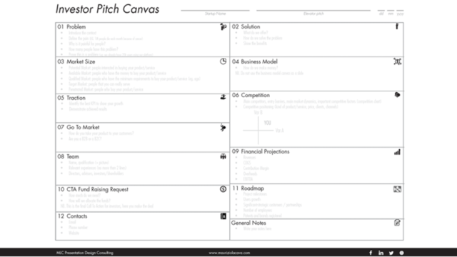 La struttura comunicativa alla base dell’ Investor Pitch Canvas parte dal problema, per giungere ad una soluzione, e dalla richiesta di raccolta fondi fino ad una roadmap per tracciare l’andamento del portafoglio d’investimento.