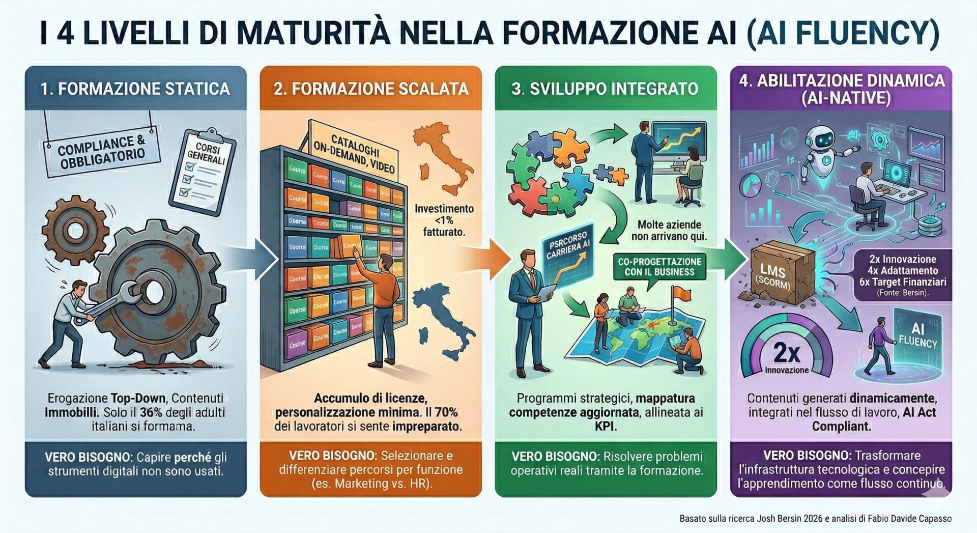 Bersin lo chiama “dynamic enablement” ed è il livello AI-native. Non si tratta di usare l’AI per costruire corsi più velocemente. Si tratta di sostituire l’intero paradigma del corso con sistemi che generano contenuti dinamicamente, personalizzati sul contesto del lavoratore, integrati nel flusso di lavoro. I risultati delle aziende a questo livello sono significativi: secondo la ricerca Bersin, sono 2 volte più propense a innovare, 4 volte più capaci di adattarsi al cambiamento, 6 volte più probabili nel superare i target finanziari. Ma arrivarci richiede una trasformazione dell’infrastruttura tecnologica (via i vecchi LMS basati su SCORM) e, soprattutto, un cambiamento nel modo in cui l’organizzazione concepisce l’apprendimento.