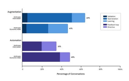 Il 65% degli intervistati descrive un uso aumentativo dell’IA: uno strumento che assiste e semplifica, ma non sostituisce. Solo un terzo parla di una delega piena. Tuttavia, confrontando queste percezioni con i dati di utilizzo reali emersi da studi precedenti, emerge una discrepanza: nella pratica, il rapporto tra compiti automatizzati e assistiti è quasi paritario (47% contro 49%). Le persone sembrano raccontare un uso più “controllato” e “collaborativo” di quanto effettivamente avvenga.