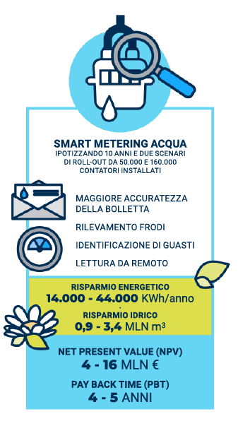 Il valore del Pay Back Time in questo caso è compreso tra 4 e 5 anni a seconda del numero di contatori considerato. Spostando il focus sui benefici ambientali, le quantità di acqua ed energia risparmiate risultano piuttosto consistenti, con valori che variano – sempre con riferimento ai due scenari – tra 0,9 a 3,4 milioni di m3/anno (ca. 18-20 m3/anno risparmiati da ogni famiglia) per quanto riguarda la risorsa idrica, e tra 14.000 a 44.000 KWh/anno (ca. 270-280 Wh/anno per famiglia) con riferimento alla componente energetica, per un totale di 6 ÷ 19 tCO2 equivalente complessivamente risparmiate.