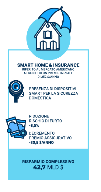 Per ultimo, una terza area che presenta notevoli opportunità fa riferimento alla possibilità di stipulare polizze assicurative per la casa in cui il premio varia sulla base del livello di “smartness” dell’abitazione. Secondo una recente indagine dell’Osservatorio, infatti, la presenza di dispositivi smart per la sicurezza domestica riduce il livello di rischio di furto e, conseguentemente, porta ad una riduzione del premio assicurativo.