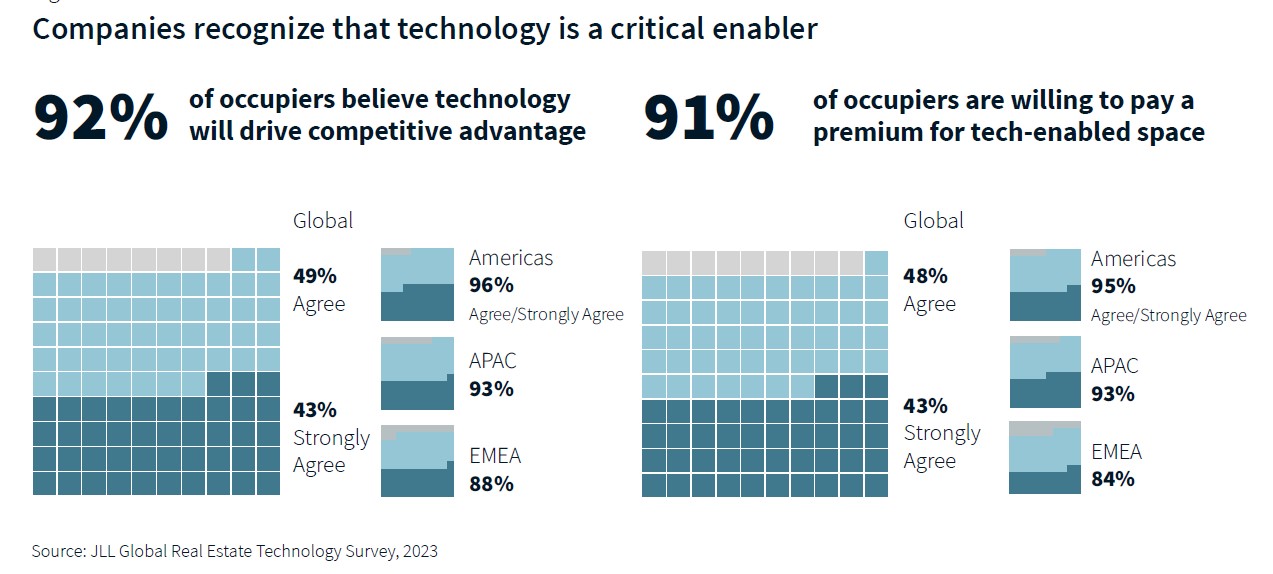 A confermare il valore della tecnologia come driver di sviluppo un dato: l’85% delle società aumenterà i propri investimenti con un particolare focus sulla sostenibilità. Tra i responsabili RE (occupiers) il 92% è convinto che la tecnologia sia un abilitatore fondamentale (43% molto d’accordo, 49% d’accordo). Il 91% nel suo complesso (43% molto d’accordo, 48% d’accordo) è disponibile a pagare un canone più alto per uno spazio tech-enabled.