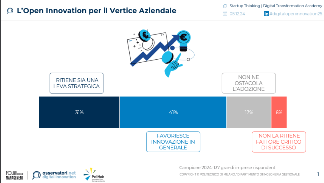 Per l’Italia si tratta di una sfida tutta da cavalcare. Numerosi sono, infatti, i pain points dell’ecosistema imprenditoriale italiano: il limitato accesso ai capitali (con contributo contenuto da parte delle corporate), scarsa cultura imprenditoriale, troppa burocrazia e un ambiente non sufficientemente inclusivo. È vero, però che alcuni dati ci fanno pensare ad una crescita nella consapevolezza su quanto c’è da fare: nel 2024 ben l’88% delle grandi imprese ha adottato azioni di Open Innovation, e la metà ha collaborato con startup (dati dell’Osservatorio Startup Thinking del Politecnico di Milano), mentre i finanziamenti alle startup italiane sono tornati a crescere, sfiorando gli 1,5 miliardi di euro (+32% rispetto al 2023, dati dell’Osservatorio Startup & Scaleup Hi-tech del Politecnico di Milano).