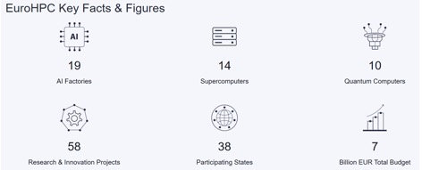 EuroHPC ha già acquisito oltre una dozzina di supercomputer Tier-0 e Tier-1 distribuiti in Europa (Finlandia, Italia, Spagna, Germania, Lussemburgo, Slovenia, Bulgaria, Repubblica Ceca, Portogallo e altri), con 14 supercomputers, 10 quantum computers e un numero crescente di AI Factories (attualmente 13, il piano è arrivare a 19).