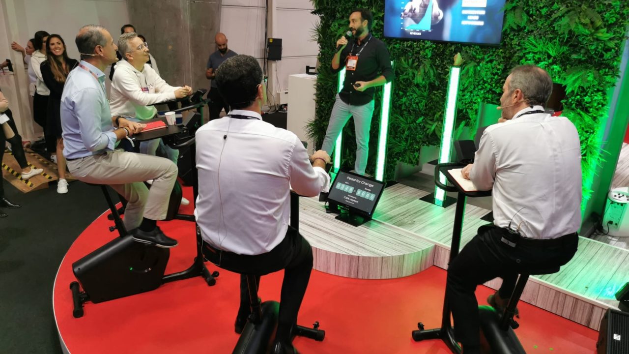 Una delle iniziative sicuramente più divertenti viste al Web Summit 2023 è stata quella di fare incontrare startup e investitori in un clima decisamente diverso e particolare: su uno dei palchi dedicati alla Sostenibilità all’interno del Padiglione 3, gli investitori sono stati fatti accomodare su cyclette che producevano la corrente che alimentava monitor e palco su cui le startup si esibivano.