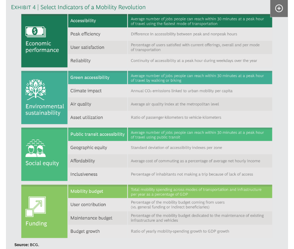 Per guidare la rivoluzione della mobilità urbana, le città dovrebbero cominciare a impiegare strumenti di misurazione per capire svantaggi e vantaggi di questa nuova ondata. Devono perciò dotarsi di uno schema di misurazione che possa coadiuvare le policy, possibilmente uno schema comune a tutte le aree urbane, in modo che possano confrontarsi su cosa funziona e cosa no. Qui sotto un esempio degli indicatori da usare nella misurazione.