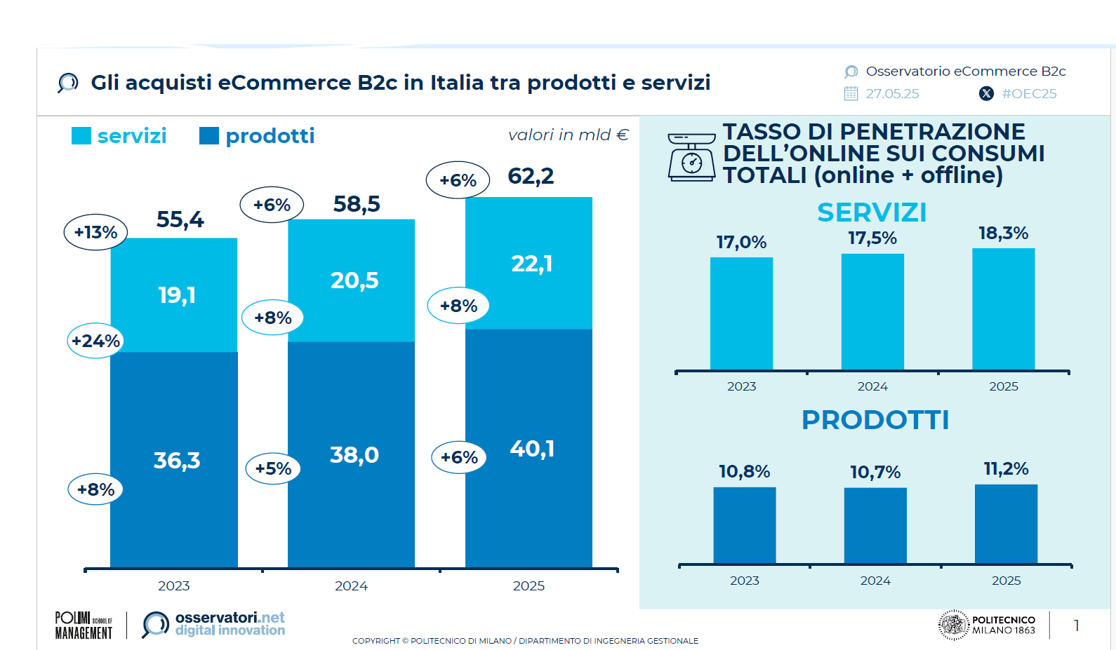Nel 2025 gli acquisti online di prodotto valgono circa 40,1 miliardi di euro, +6% rispetto al 2024, dice la ricerca dell’Osservatorio eCommerce B2C Netcomm – School of Management del Politecnico di Milano presentata il 27 maggio 2025.