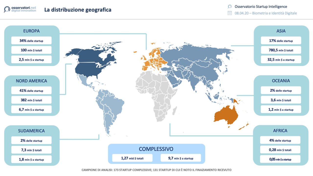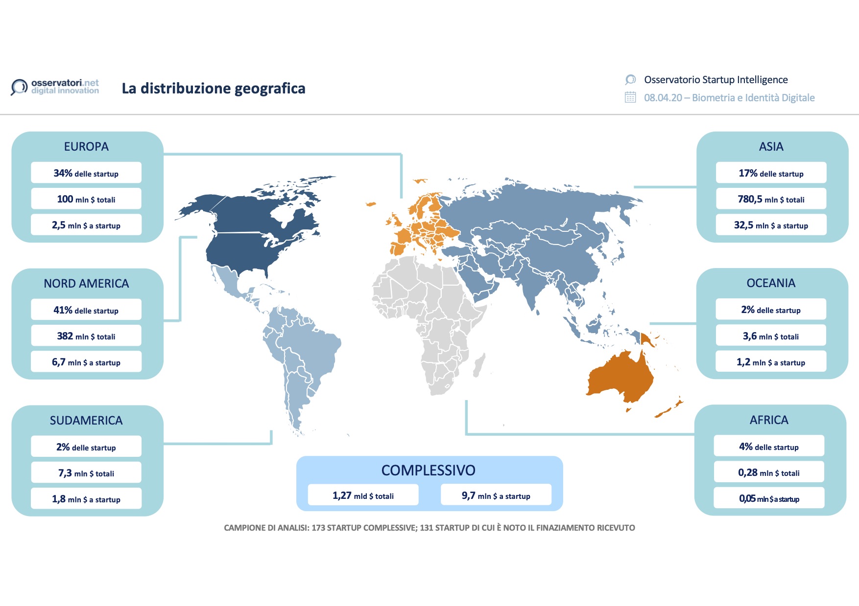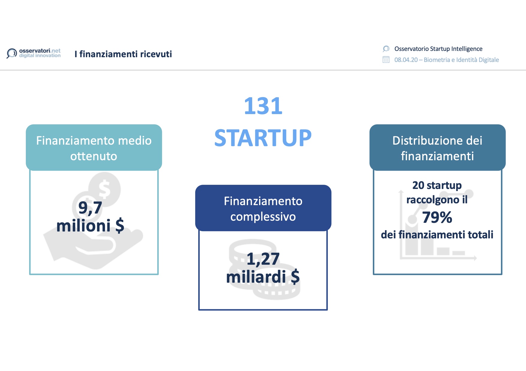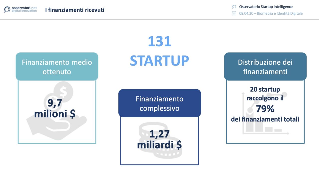 Con l’obiettivo di capire quante sono le nuove imprese che hanno costruito la propria offerta in questo ambito e come è possibile classificarle, l’Osservatorio Startup Intelligence, in collaborazione con il Tavolo di Lavoro Digital Identity del Politecnico di Milano, ha censito 173 startup internazionali operanti nell’ambito dell’identità digitale, concentrandosi su quelle nate a partire dal 2015 e che hanno ricevuto il loro ultimo finanziamento dal 2018. Delle 173 startup individuate sono noti i dati sui finanziamenti di 131 realtà. L’ammontare complessivo dei finanziamenti è pari a circa 1,27 miliardi di dollari, con una media di poco meno di 10 milioni di dollari per startup, segno di un buon interesse da parte degli investitori.