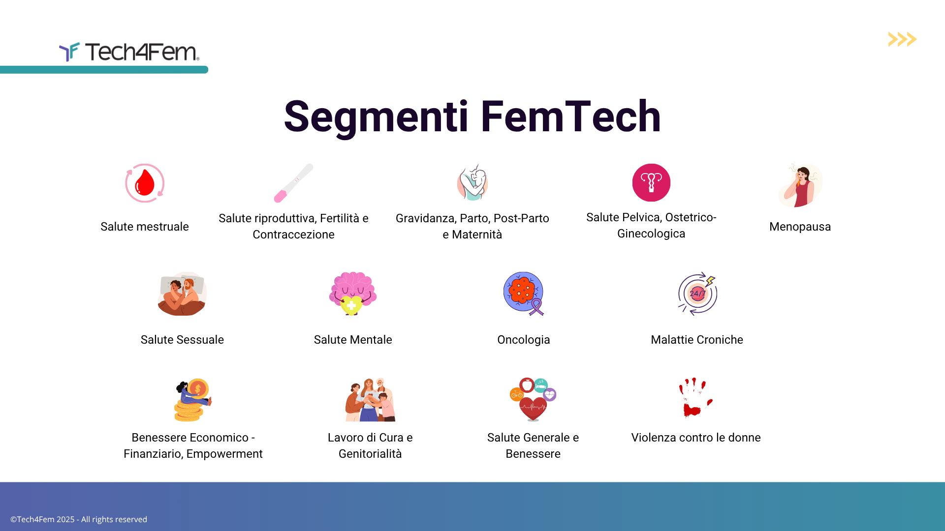 La classificazione elaborata dall’Osservatorio identifica 12 segmenti Femtech che comprendono: salute mestruale, salute riproduttiva, gravidanza, salute pelvica, menopausa, salute sessuale, salute mentale, oncologia, malattie croniche, benessere economico, lavoro di cura, benessere generale e violenza.
