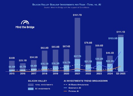 L’AI sta letteralmente ingoiando il venture capital. Questi sono solo alcuni dei dati dell’ultimo Report “Physical AI. Shaping the Market of the New Possible” presentato da Mind the Bridge allo Scaleup Summit che si svolge a San Francisco questa settimana.