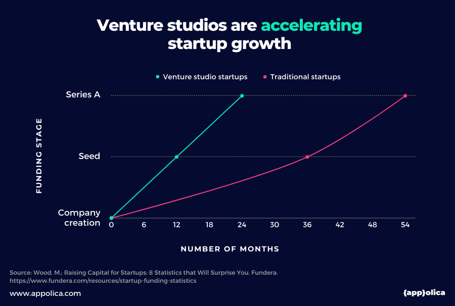 - Velocità di sviluppo: grazie a processi standardizzati e capitali immediatamente disponibili, le startup da studio raggiungono il round Series A in circa 25 mesi, contro i 56 mesi delle startup tradizionali. Arrivano ai round successivi (Series B e C) in tempi ridotti del 40–50% e anche le exit (acquisizioni o IPO) avvengono prima: in media 5 anni invece di 7,5.