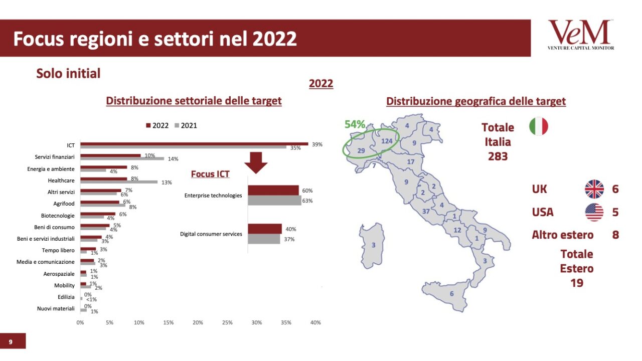 “A livello settoriale notiamo ancora un grande focus sul comparto dell’ICT”. Afferma Anna Gervasoni, professoressa Liuc-Università Cattaneo, “Una novità interessante riguarda la distribuzione geografica degli investimenti: oltre alla consueta concentrazione delle operazioni nell’area del Nord Ovest, nel 2022 si assiste a una copertura nazionale degli investimenti, segno della sempre maggiore presenza e capillarità degli investitori sul nostro territorio”.